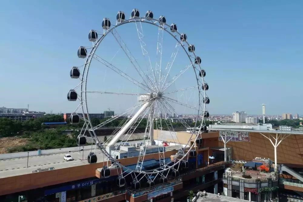 GLC-52A觀覽車是中山金馬自主研發的觀覽車類游藝機。整個產品由塔架、主軸、轉盤、吊廂、驅動系統組成。塔架由2根立柱構成,分布在轉盤一側,整個轉盤呈懸臂梁結構,在塔架支撐的基礎上增加鋼索固定。主軸水平布置,主軸上的轉筒隨著設備運行而轉動。轉盤采用桁架式結構,轉盤上均勻地分布著30個吊廂,每個吊廂最大乘客量6人。游客乘座吊廂沿轉盤運行,體驗著觀光賞景的樂趣;新穎獨特的懸臂結構,再配以明麗變幻、動感迷人的燈飾,別具匠心的現場配景,以及柔美動聽的背景音樂,使得本設備深受游客的歡迎,也是一個重要的城市地標。