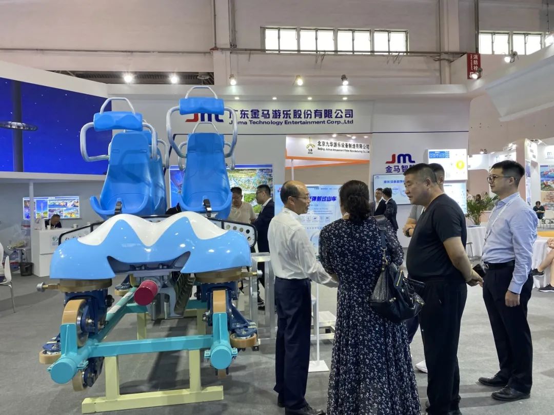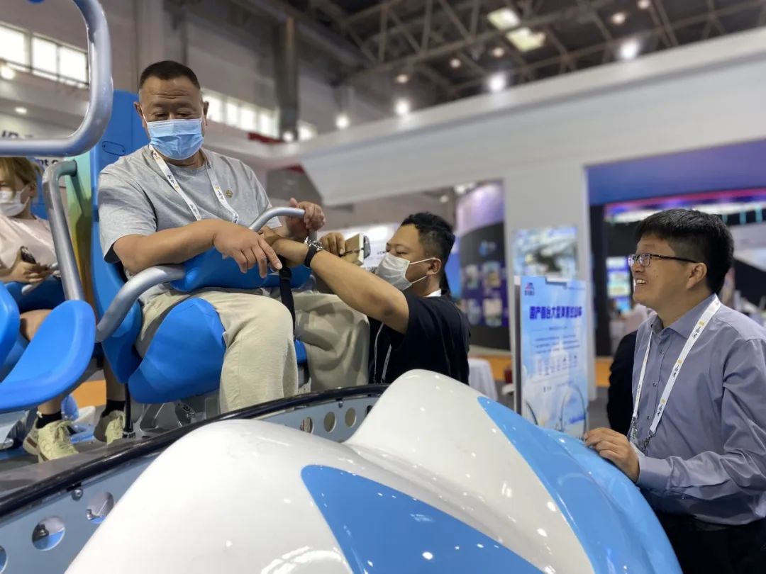 金馬文旅科技在本次展會上集中展示了飛行影院、黑暗乘騎、4D影院等多個虛擬沉浸式系列產品的落成案例,96座翻轉式飛行影院《飛躍泰山》、6自由度動感黑暗乘騎《盤古開天》呈現出的震撼效果體現了金馬文旅科技在沉浸式項目創意設計、內容策劃及總體集成能力的跨越式進步,近兩年打造的一個又一個虛擬沉浸式高科技文旅示范標桿項目,有效引領了行業創新,助力數字沉浸式產品高質量發展,得到前來觀展、交流的行業領導、專家認可與贊賞,客商合作意向不斷。