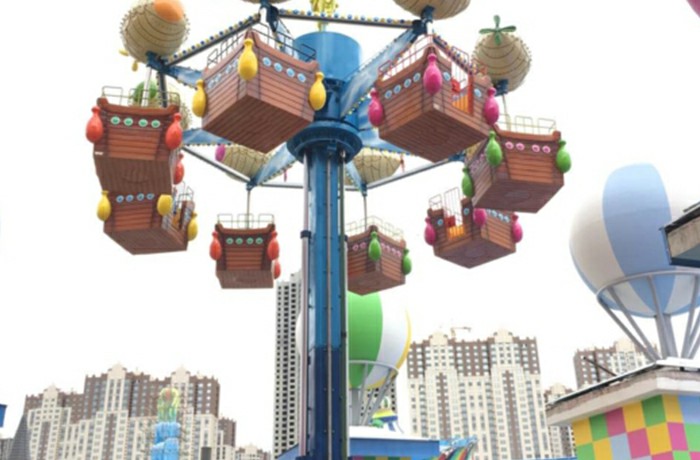 集旋轉、升降運動形式于一體的自控飛機類游藝機。逍遙塔是一款適合家庭游玩的游樂設備。設備啟動后,座艙在升降運動的同時繞立柱中心軸旋轉,同時座艙還可以自由旋轉,運動過程乘客可以體驗到乘坐游玩的樂趣。