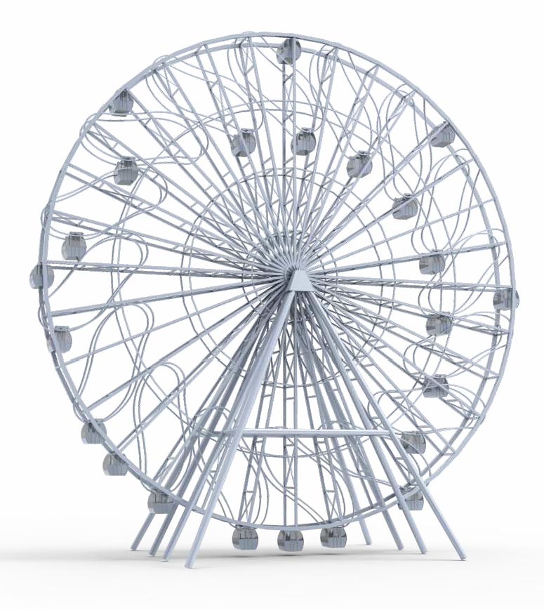 46米搖擺觀覽主體采用經典的桁架式結構,轉盤設計有8個固定座艙及16個搖擺座艙,兩種不同的座艙形式分別給乘客以傳統游覽車及滑行車的不同體驗。吊廂運作時配以明麗變幻的燈飾,搭配別具匠心的內飾配景,以及柔美動聽的背景音樂,乘客在吊箱內多?度地縱覽周邊美景。