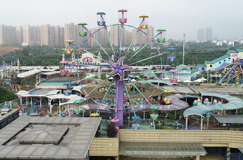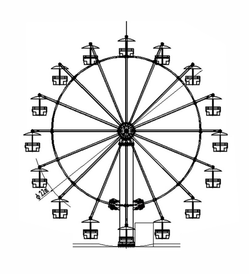 ?型摩天輪可承載48?,主要由?柱、塔頭、旋轉頭、轉輪、避雷針、吊籃、驅動裝置和電?系統等組成,并配備燈光和?響。設備外觀萌趣、造型?巧精致,能為樂園??提升歡樂?氛,是公園和游樂場很受歡迎的觀覽游樂設備。