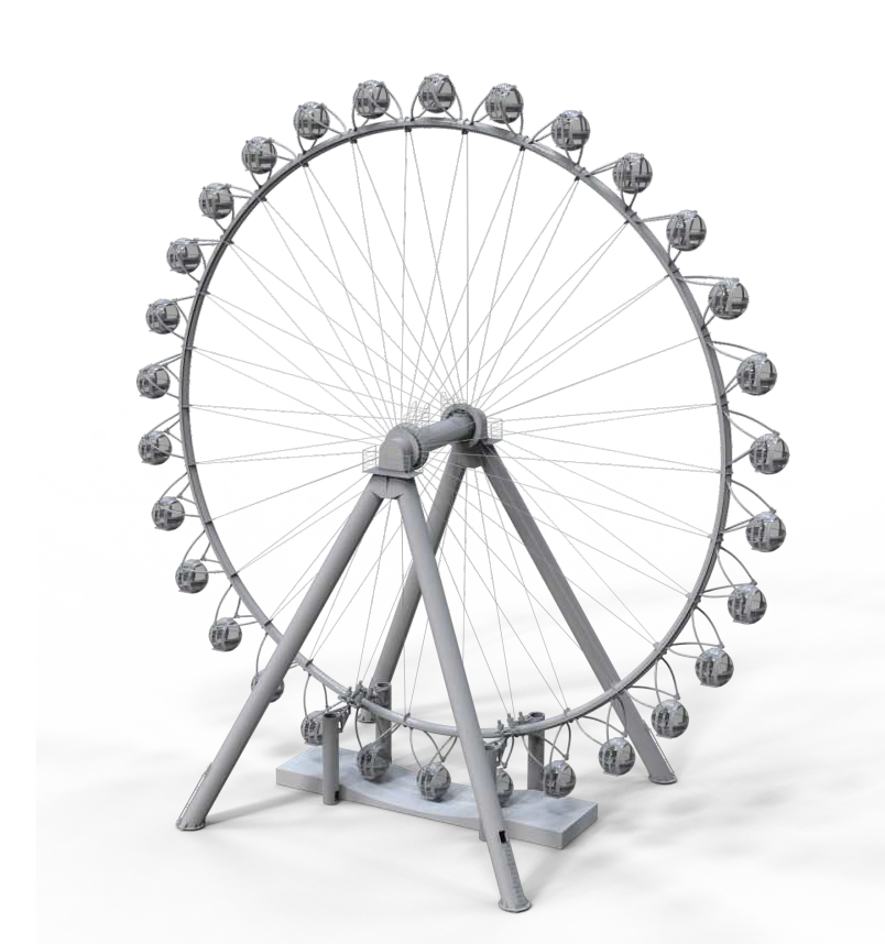 觀覽?塔架采?新穎的4?柱?橫梁極簡結構,搭配單管輻條式轉盤和圓球艙,整體姿態盡顯現代簡約之美。觀覽??轉盤上均勻分布著30個?珠般的圓球吊廂,單管輻條式設計令艙內觀景視野開闊通透,可供180?觀光。在夜間滿環律動的燈光能瞬間點燃夜場?氛推?觀覽激情。